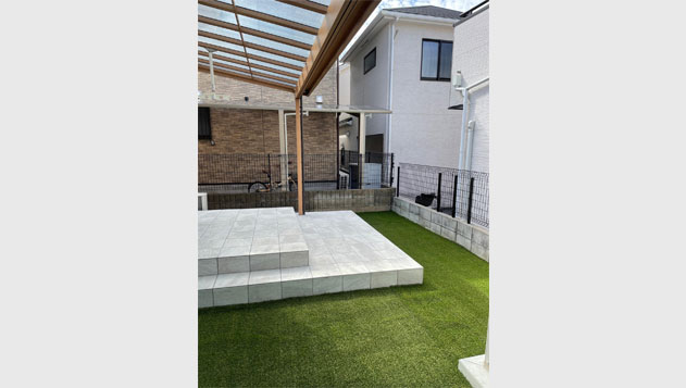 お勝手口からアクセスできる裏手のお庭を、ご家族の語らいのスペースにリニューアルすべく、タイルデッキの新設と人工芝の敷設などを施し、新しい「おうちじかん」をお愉しみ頂けるように致しました。